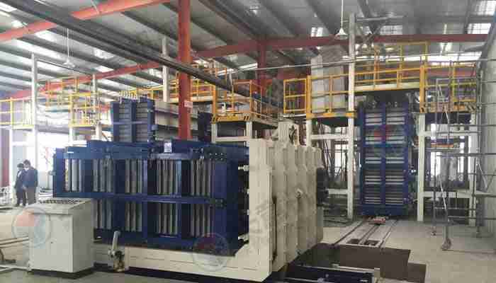 該復(fù)合墻板生產(chǎn)線立式旋轉(zhuǎn)臥式出板復(fù)合墻板成型機(jī),一次可生產(chǎn)四十塊墻板,該生產(chǎn)線主要分為:配料攪拌系統(tǒng)、墻板成型系統(tǒng)、液壓整體開(kāi)模系統(tǒng)、液壓翻轉(zhuǎn)系統(tǒng)、整體出板翻轉(zhuǎn)碼垛系統(tǒng)、成型機(jī)自動(dòng)循環(huán)系統(tǒng)、變頻擺渡系統(tǒng)、數(shù)控配電系統(tǒng)等部件 組成。該生產(chǎn)線自動(dòng)化程度高,液壓開(kāi)合模,解決了傳統(tǒng)立式復(fù)合墻板機(jī)人工開(kāi)合安全隱患,提高了工作效率。設(shè)備配有整體出板碼垛系統(tǒng),解決了傳統(tǒng)人工出板方式,減少產(chǎn)品的破損率,提高了產(chǎn)能。生產(chǎn)線使用密封式泵送系統(tǒng)配備雙工位注漿槍?zhuān){速度快密實(shí)度高,材料粘結(jié)更緊密。